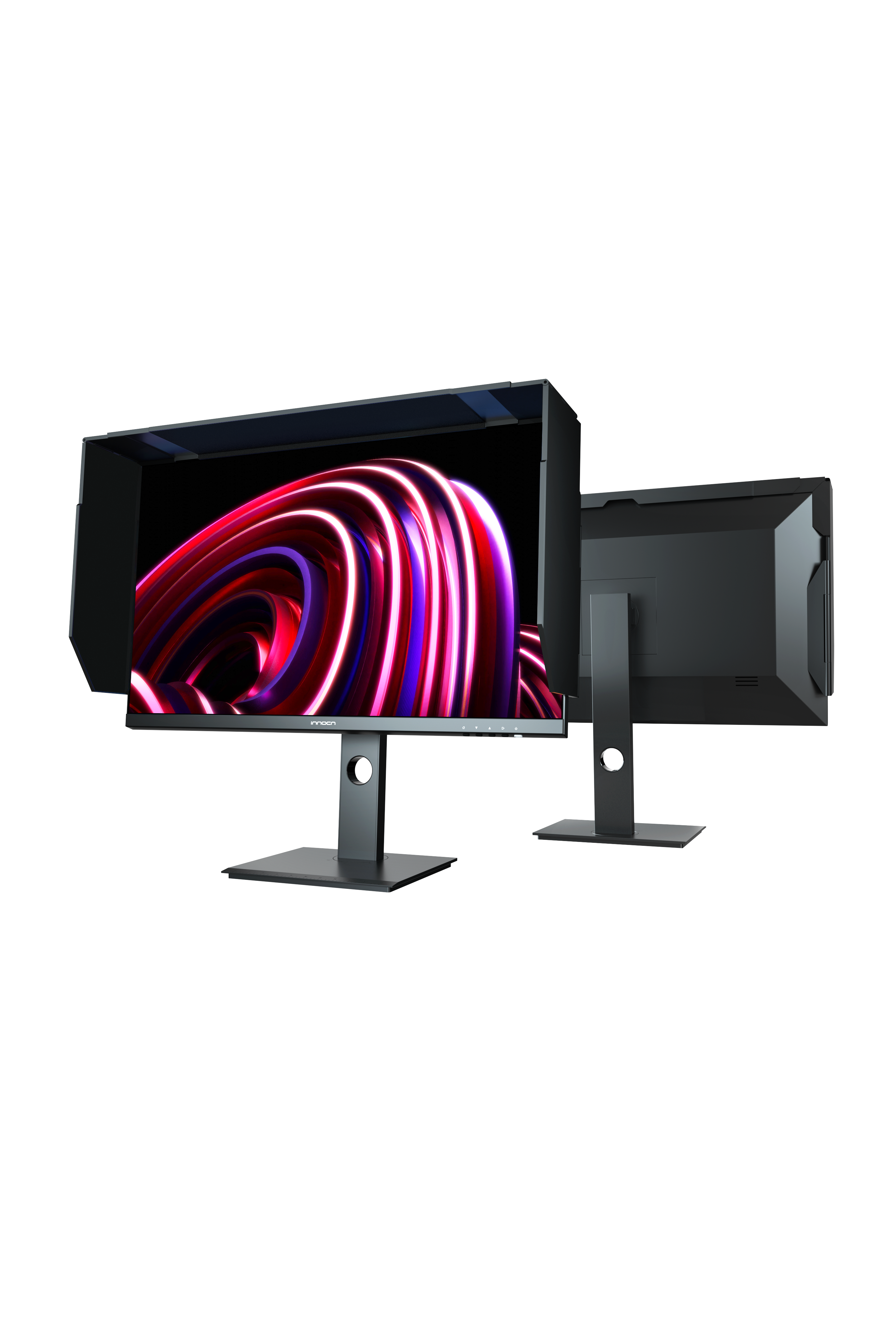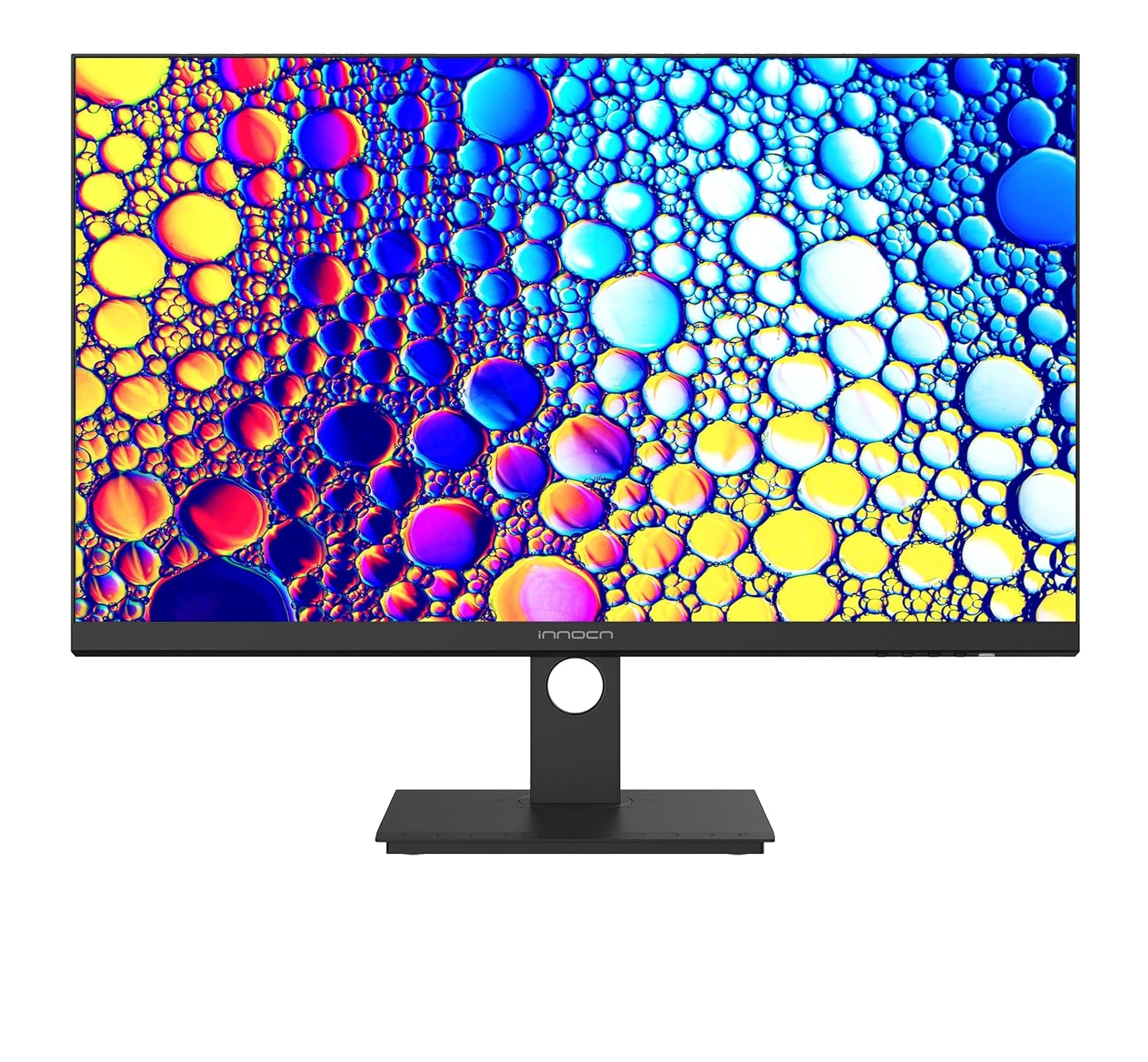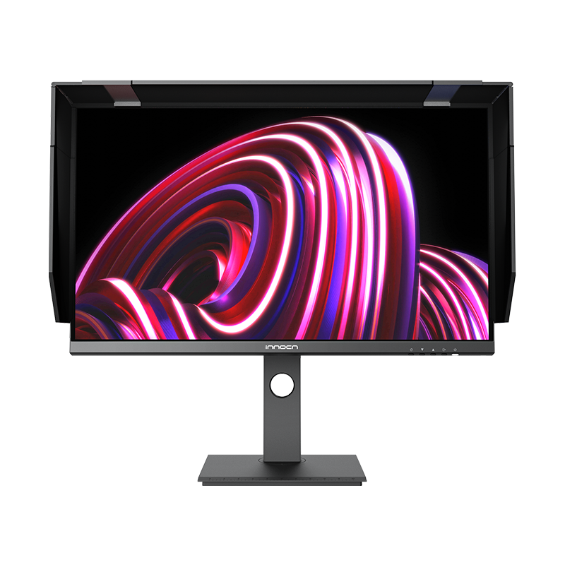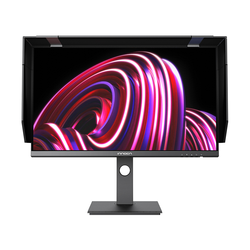 Profesionální monitor INNOCN 27C1U-Pro - úhlopříčka 27 palců, IPS 10bitů, 4K 60Hz, 3840 x 2160, HDR400, USB Type C, DP, HDMI, vestavěné reproduktory, otočný/výškově nastavitelný stojan, černá barva, lesklý displej.